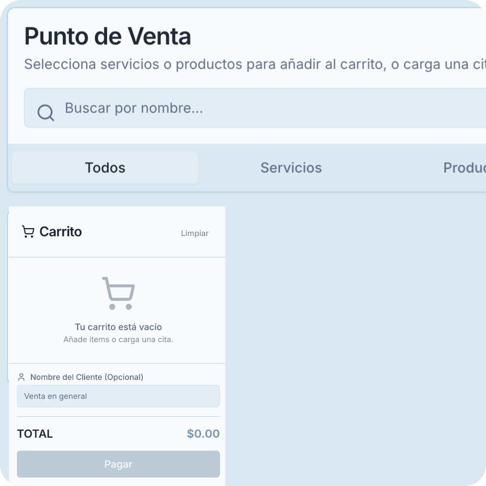 Cobra al instante tus servicios o productos al mismo tiempo, y al terminar un servicio podrás cobrar la cita programada en el día sin tener que volver a cobrar lo que el cliente solicitó, acepta efectivo, tarjeta o transferencia bancaria.